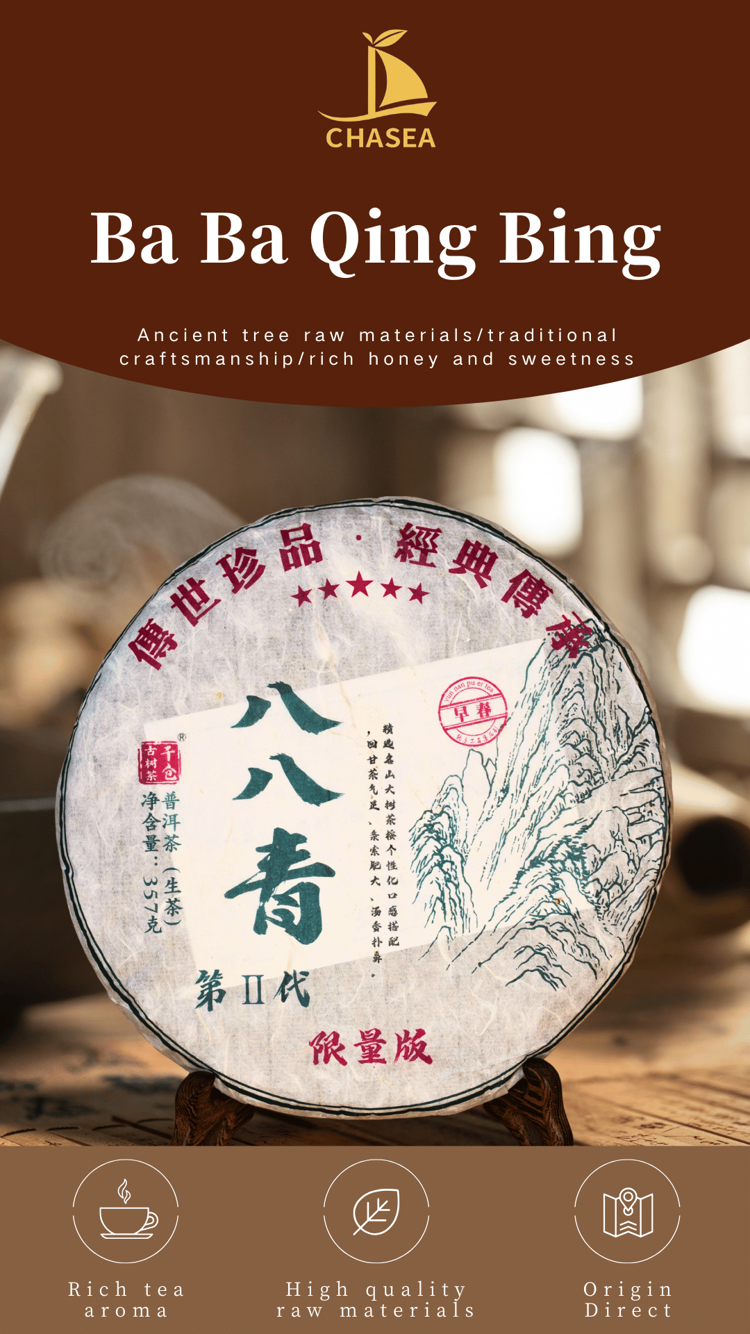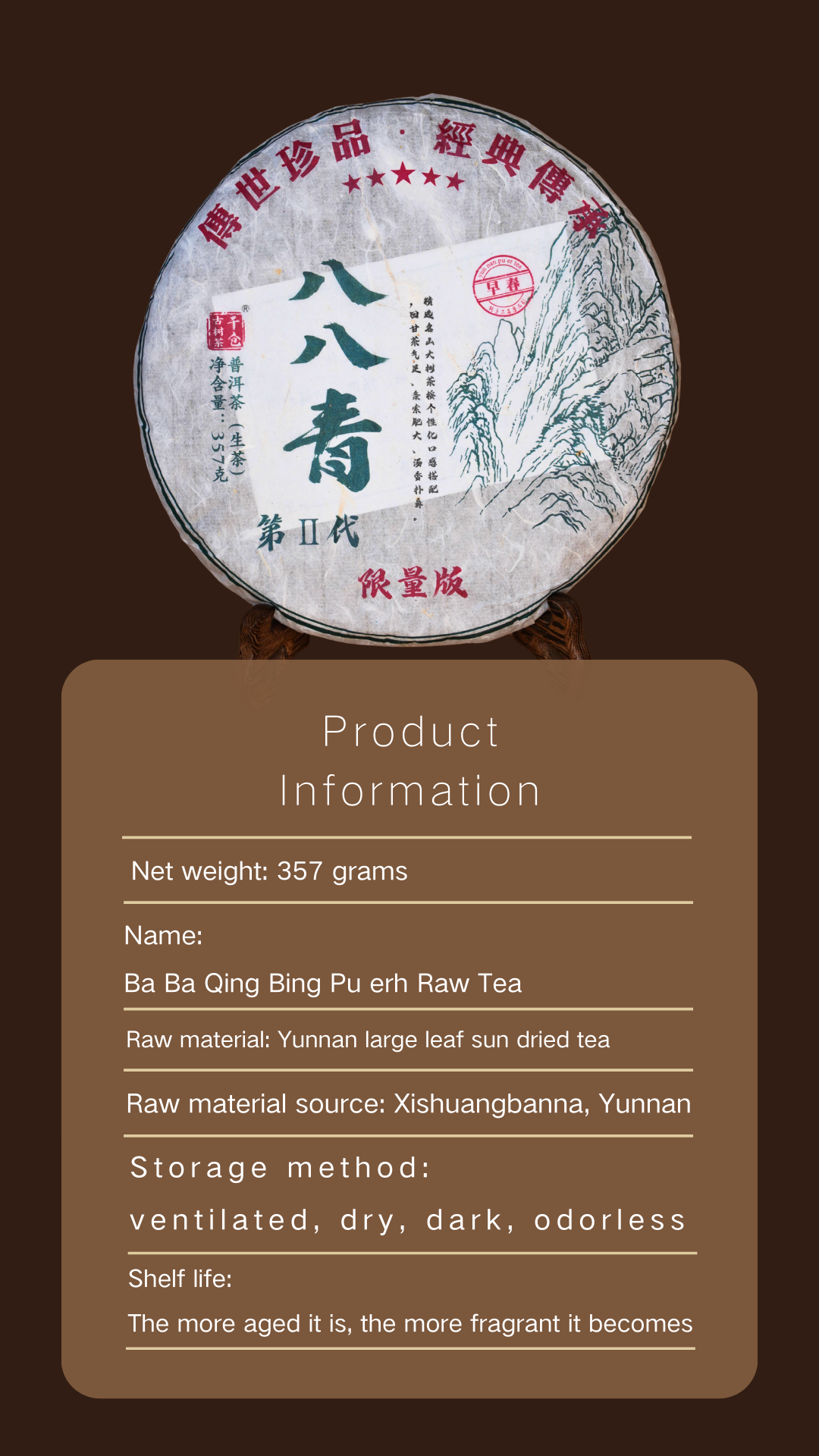 Previous Product Puerh Raw Tea Cake 357g Chinese Tea Unfermented aids Digestion can be Collected as Festival Gift $230.00 Purchase & earn 230 points! Puerh Raw Tea Cake 357g Chinese Tea Unfermented aids Digestion can be Collected as Festival Gift quantity Add to cart 立即购买 / BUY NOW Category: Pu'erh Tea Description Reviews (0) Description Reviews There are no reviews yet. Be the first to review “Puerh Raw Tea Cake 357g Chinese Tea Unfermented aids Digestion can be Collected as Festival Gift” Cancel replyYour email address will not be published. Required fields are marked *Your rating * Rate… Perfect Good Average Not that bad Very poor Your review *Name * Email * Save my name, email, and website in this browser for the next time I comment. Opens in a new window Tweet This Product Opens in a new window Share on Facebook Opens in a new window Pin This Product Opens in a new window Mail This Product Related products Quick View Sale! Quick View Pu'erh Tea2019 BingDao JinZhen Ripe Puerh Tea Low Inventory Product Promotion $399.00 Original price was: $399.00.$168.00Current price is: $168.00. Purchase & earn 168 points!Add to cart Quick View Quick View Pu'erh Tea, rare pu'erh2000 Yiwu Ripe Puerh Tea Cake 357g Dry-aged for 20 years · A masterpiece of raw tea cake collection $219.00 Purchase & earn 219 points!Add to cart Quick View Quick View Pu'erh Tea, rare pu'erh90s Grade A Large Green Print Pu-erh Raw Tea Cake Ultra-Rare (Only 10+ Cakes!) $199.00 Purchase & earn 199 points!Add to cart